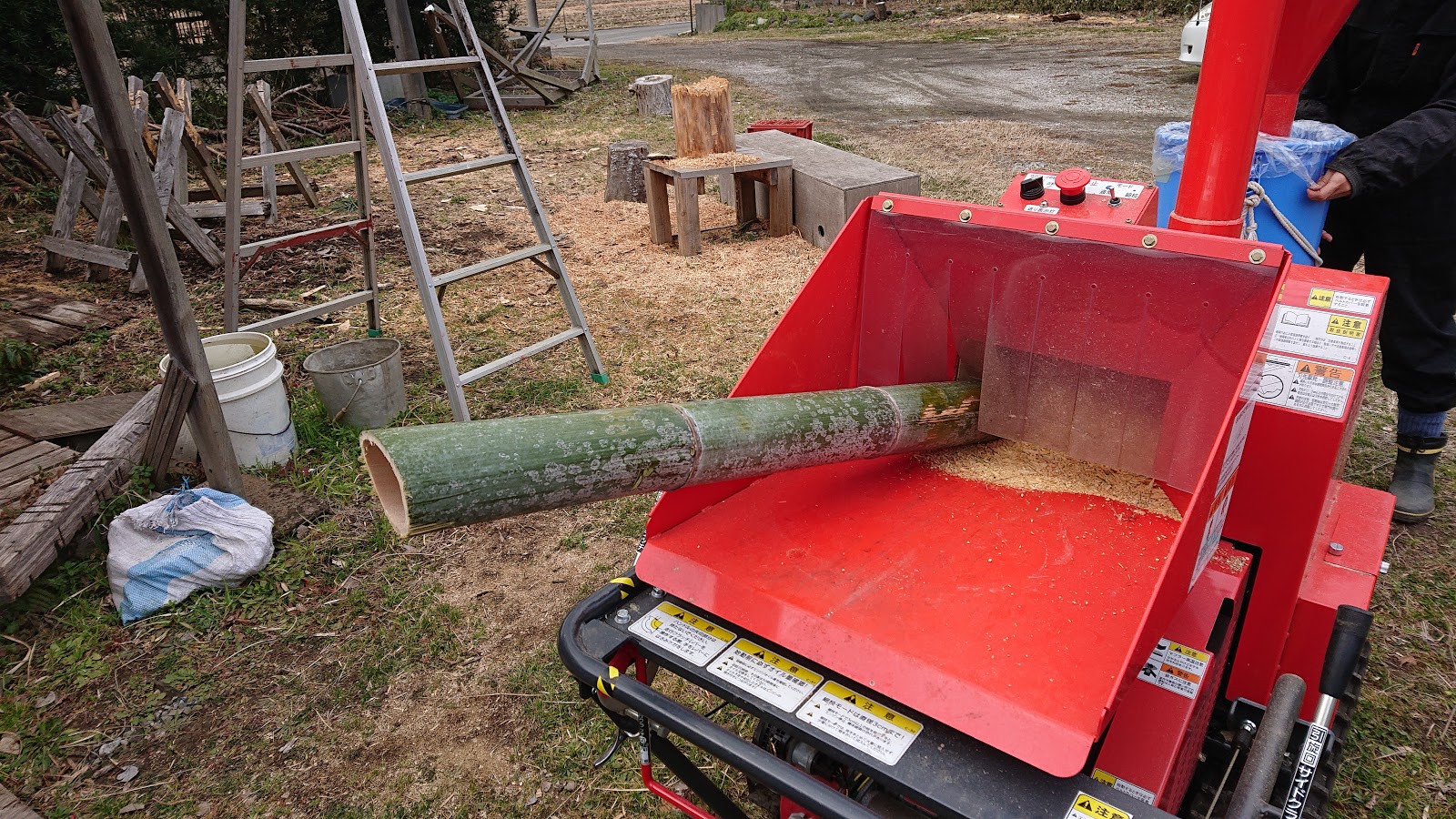 先日切り出した竹を,今日チッパーで粉砕して竹パウダーを製造しました。